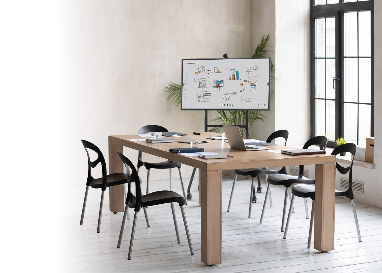 Dzięki smukłemu, 65-calowemu wyświetlaczowi na mobilnej podstawie z dużymi, skrętnymi kółkami, możesz przekształcić każde pomieszczenie w przestrzeń do współpracy. Dzięki obsługiwanej funkcji obracania można zoptymalizować orientację i kąt widzenia i przekształcić nawet najmniejsze obszary w efektywne sale konferencyjne.