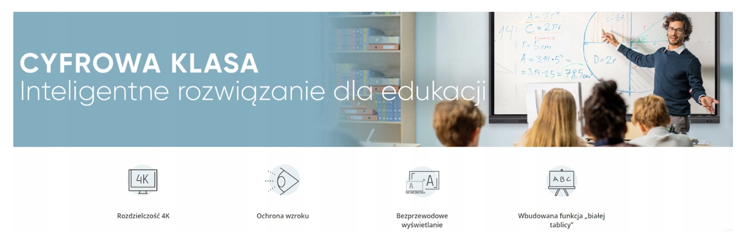 - Zawartość opakowania: Monitor interaktywny, pilot, uchwyt ścienny, pisaki 2szt., kabel zasilający