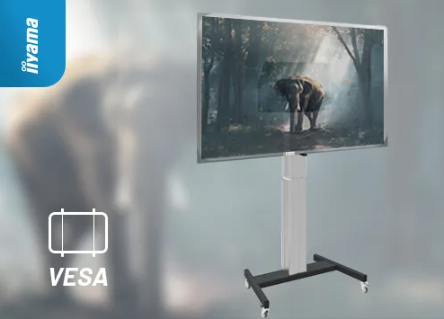 Ekran możesz zamocować na dowolnym uchwycie ściennym czy sufitowym zgodnym ze standardem VESA w danym rozmiarze. Uchwyt ten zagwarantuje także możliwość montażu monitora na wózku jezdnym, elektrycznej kolumnie czy też innych konstrukcjach zgodnym z VESA