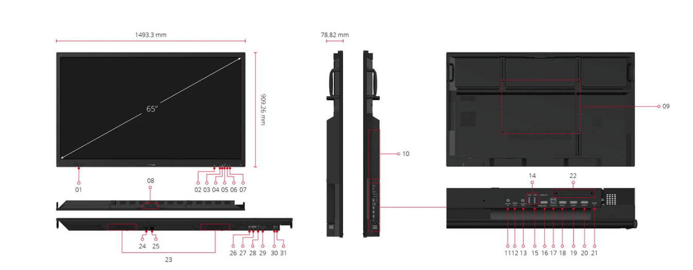 - USB Typ C: przód x1 (DP 1.2, dotyk, Ethernet 100M, USB 3.2 Gen 1, inteligentny USB 2.0, PD 65W), tył x1 (DP 1.2, dotyk, Ethernet 100M, USB 3.2 Gen 1, inteligentny USB 2.0, PD 100W), Góra x1 (USB 3.2 Gen 1 + PD15W do obsługi montażu kamery)