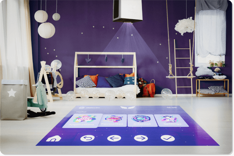 Obraz na tablecie i na urządzeniu jest zawsze idealnie zsynchronizowany. Wszystko co użytkownik zrobi na tablecie, od razu pojawia się na ekranie projekcji, a każda interakcja z obrazem na podłodze lub ścianie również widoczna jest na tablecie.
