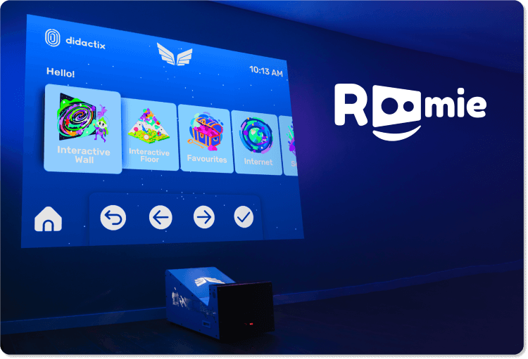 Roomie to połączenie ściany i podłogi interaktywnej w jednym urządzeniu, do wyświetlania obrazu na dowolnej płaskiej powierzchni. Pełna mobilność urządzenia sprawia, że z łatwością można je przemieszczać między klasami, salami konferencyjnymi czy gabinetami.